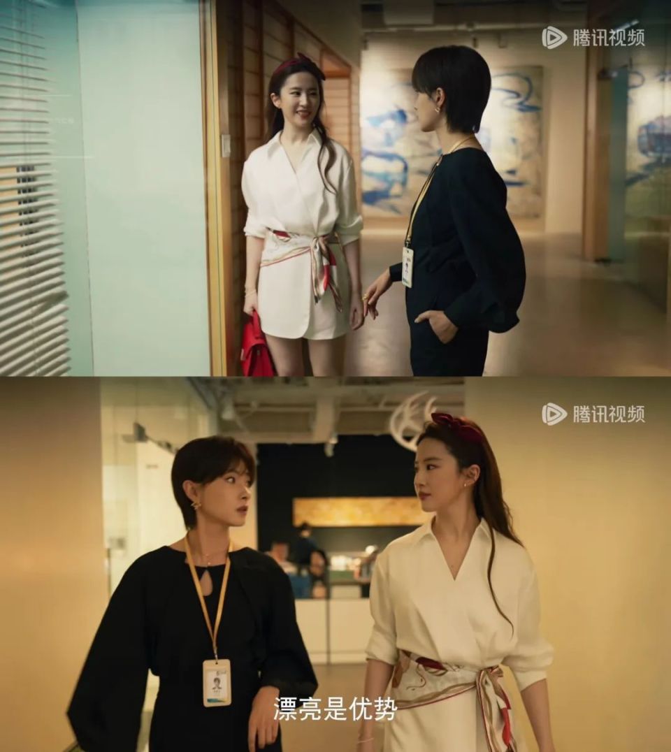 复试时黄亦玫更是将丝巾打破常规的系法,巧妙围绕于腰间,易显老气的丝巾在她身上立马呈现出恣意灵动的魅力与穿搭的无限可能;入职后,苏更生给黄亦玫传授职场经验,她也礼尚往来,选择了一条丝巾送给苏苏。作为衔接剧情的重要单品,丝巾见证了她的一路成长。